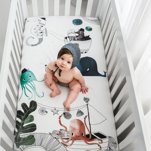 Illustrated with love by Swantje Hinrichsen, this crib sheet features beautiful touches of watercolor and a crew of sea-fairing friends.